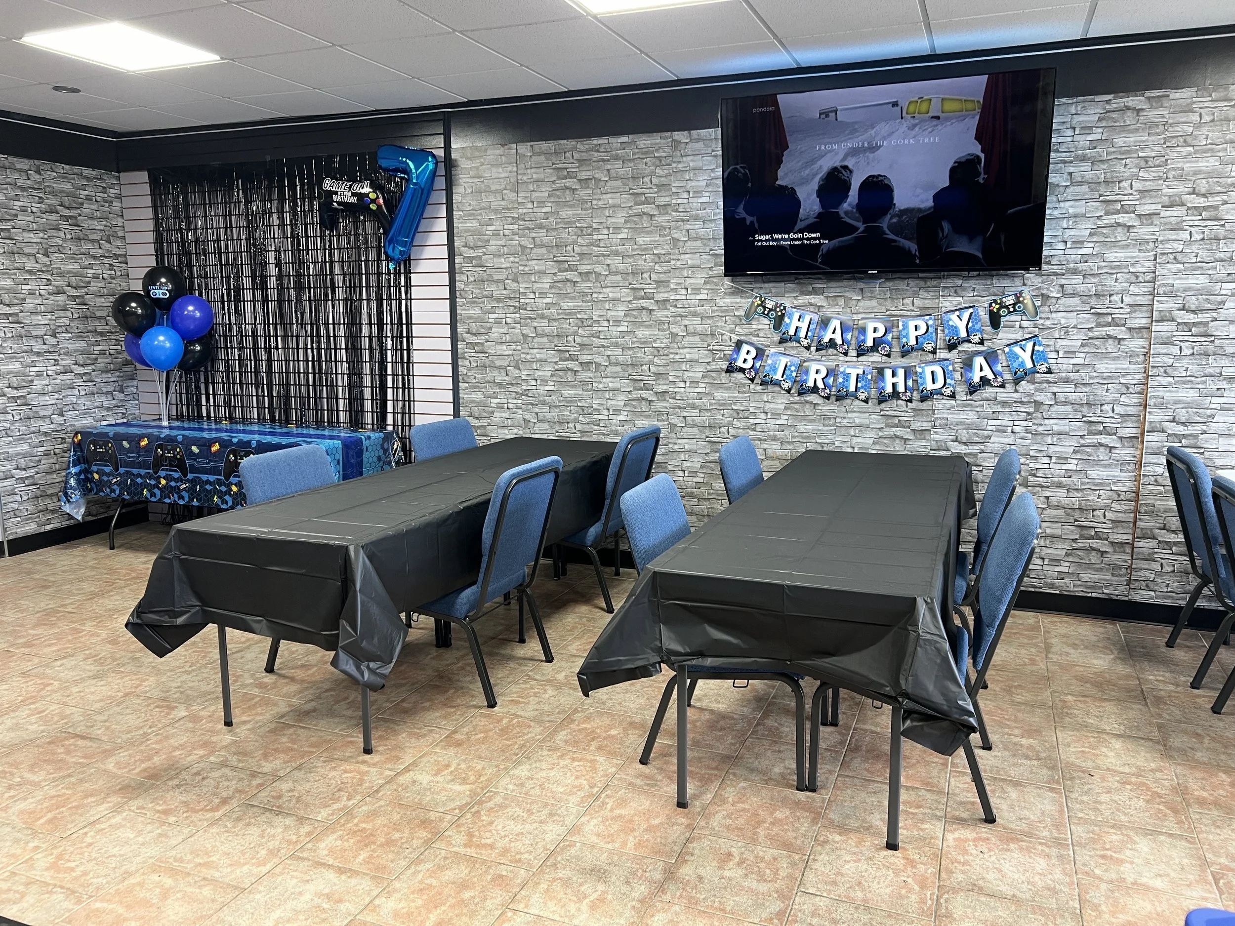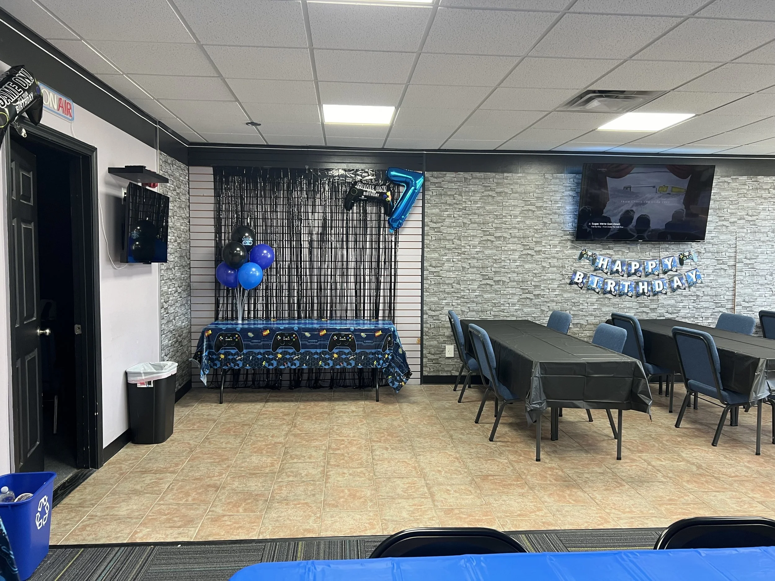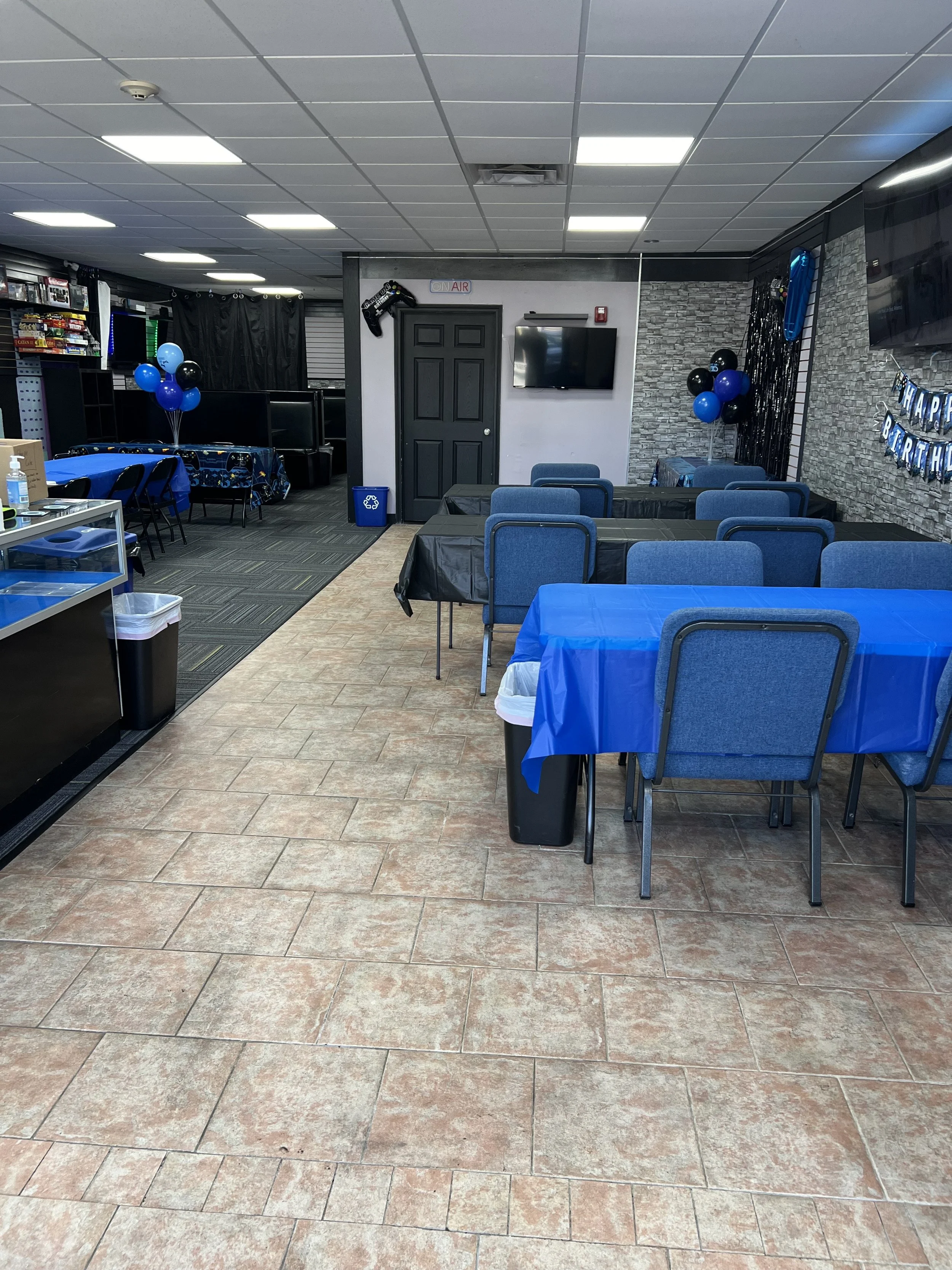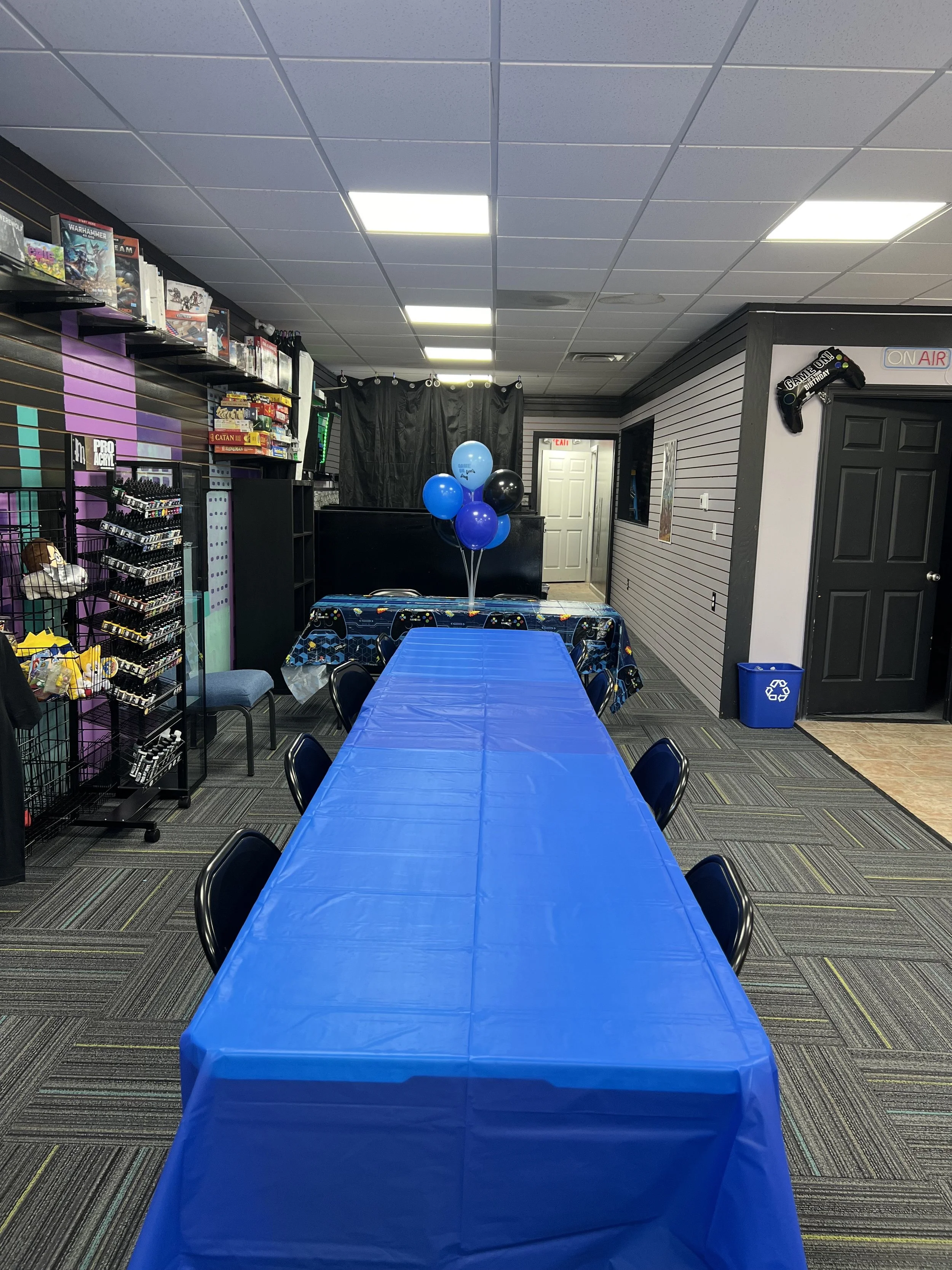 1.5 Hours of gameplay and 30 minutes for food and cake / Access to the entire store and will be closed to the public / A team member will be available to assist with setup, clean up and helping guests / Plates, utensils, napkins and table clothes are included / Basic color theme and Birthday banner / 2 slices of Pizza and 1 drink per child / Additional drinks are available to purchase / Birthday child will receive a Free gift and T-shirt.
